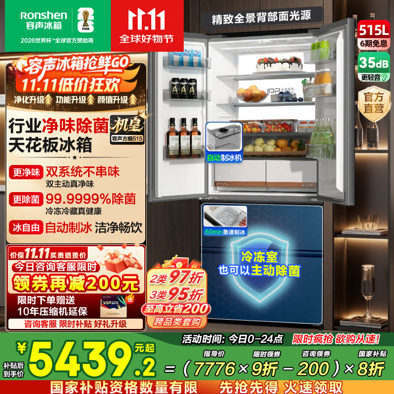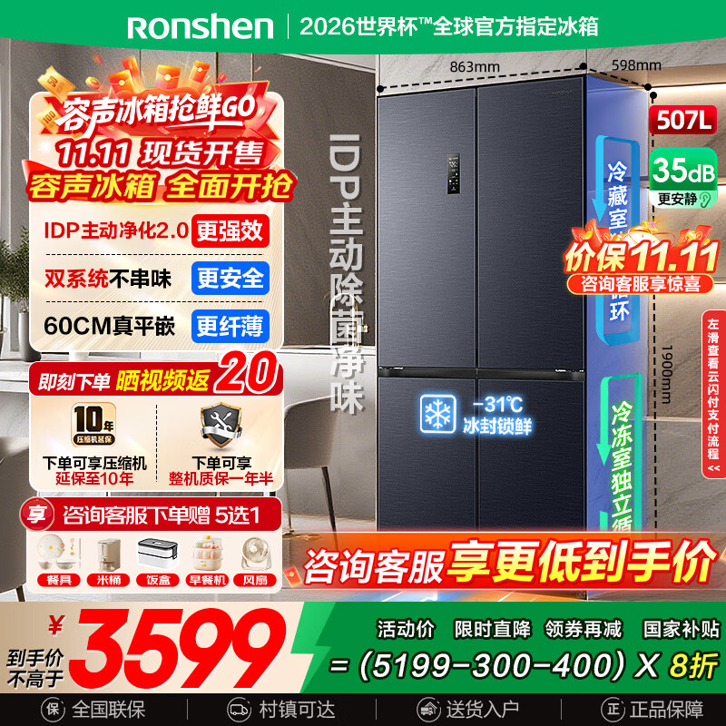 容声507升IDP2.0净味双系统十字对开四开门超薄零嵌入式电冰箱家用一级能效BCD-507E50CZLAD国家补贴 双系统嵌入主动除菌507十字