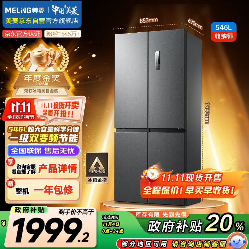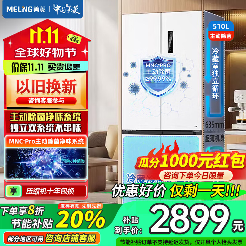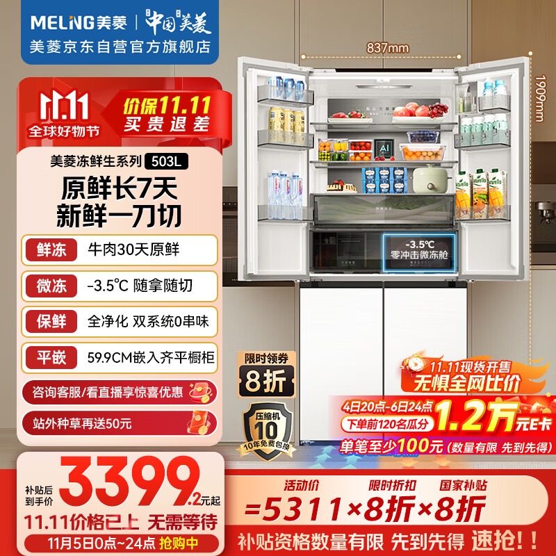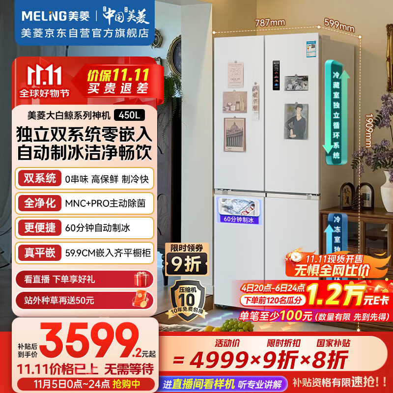 百亿补贴:BCD-451WFP9CZX 451L雪域白 美菱双系统零嵌451L法式多门一级节能家用大容量电冰箱官方正品