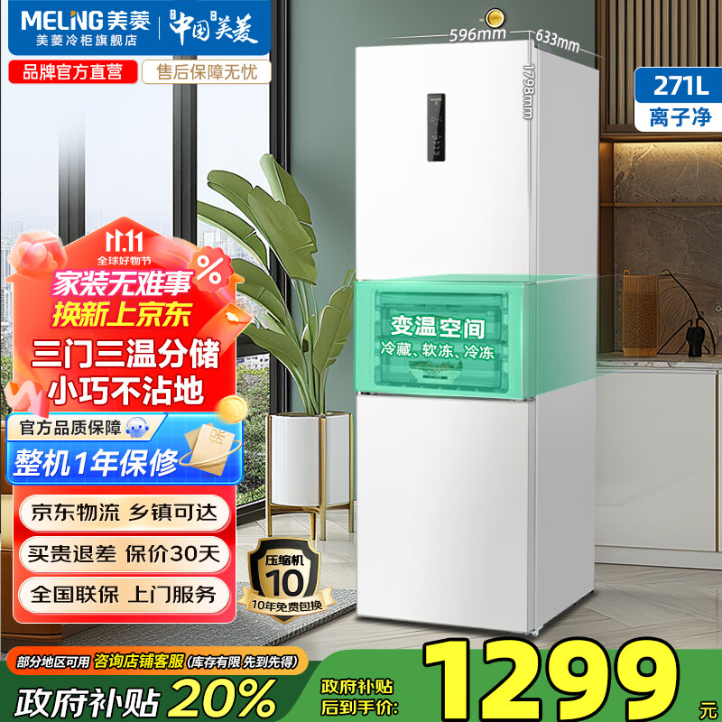 MELING/美菱 271升 三门 冰箱 BCD-271WP3CX
