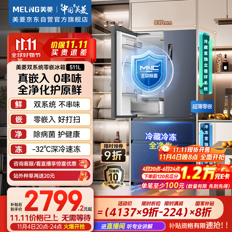 meiling/美菱 无忧嵌511升 法式多门 冰箱 BCD-511WFP9CZX BCD-511WFP9CZX