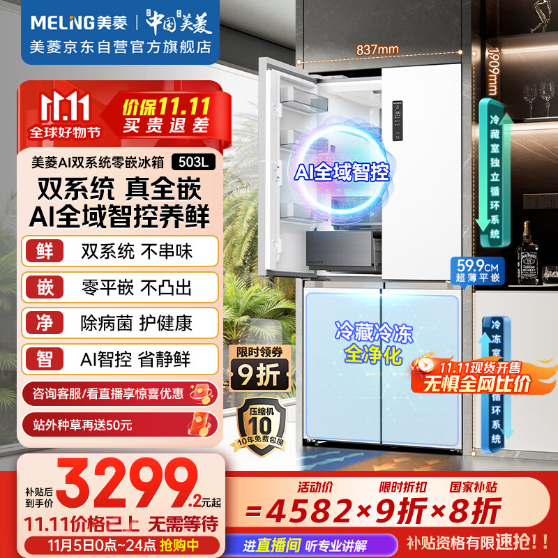 meiling/美菱 BCD-507WP9CX 507升 冰箱 超薄嵌入一级能效风冷无霜