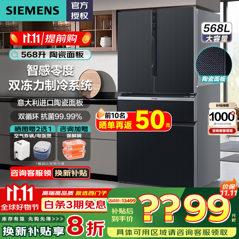 西门子(SIEMENS)568升法式多门四门冰箱双循环风冷无霜双压缩机智感零度保鲜智控调湿以旧换新政府补贴 KF96NPX50C 戳客服必享优惠