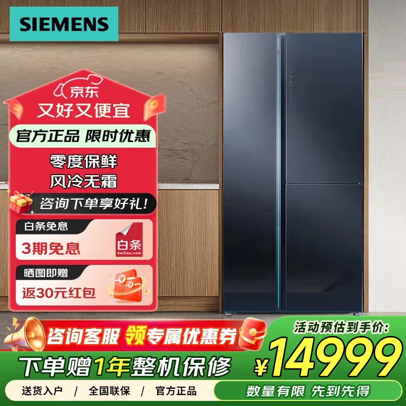 百亿补贴:KC88EA256C 503L湖蕴蓝 新品西门子无界平嵌入十字门冰箱
