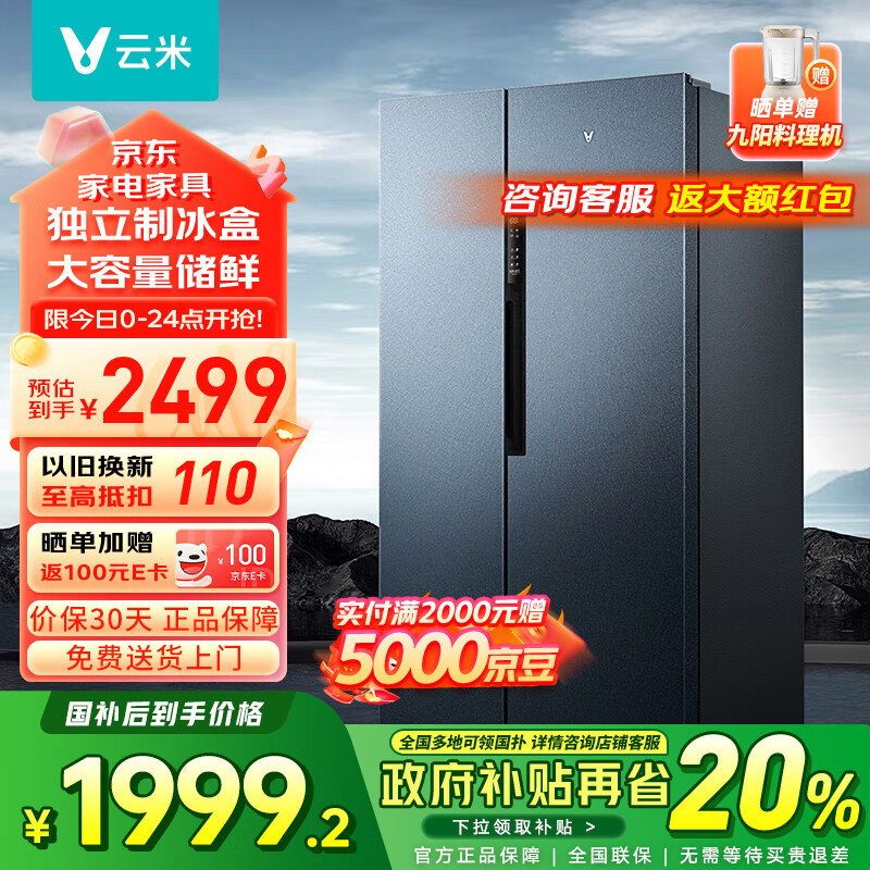 云米 冰箱 603L 双开门,一级能效,智能变频,风冷无霜,制冰