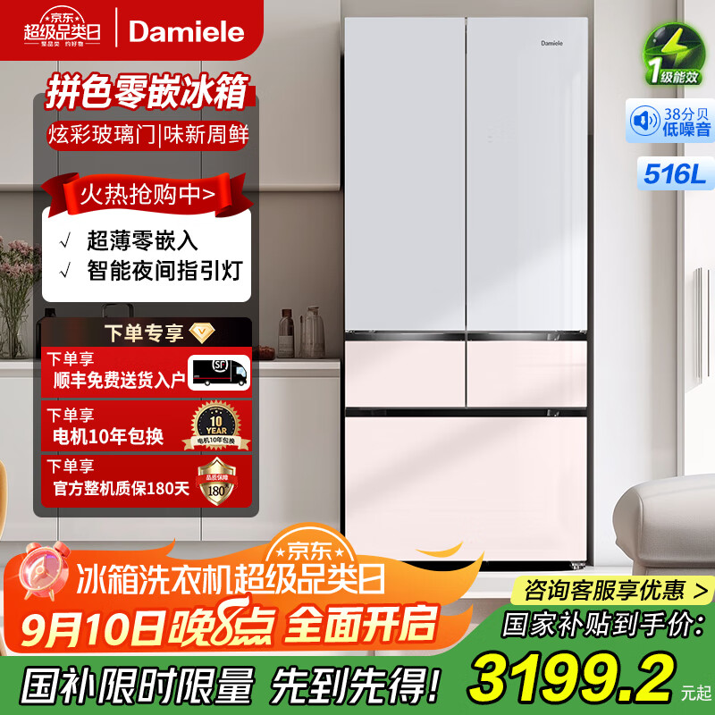 达米尼516水蜜桃玻璃门超薄嵌入多门拼色冰箱家用风冷无霜 樱花粉浅云白BCD-516WKDGD 樱花粉浅云白BCD-516WKDGD