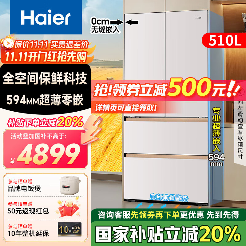 政府补贴山茶花海尔485升冰箱法式多门零嵌入全空间保鲜594mm超薄 【山茶花485】零嵌全空间|整机一年质保