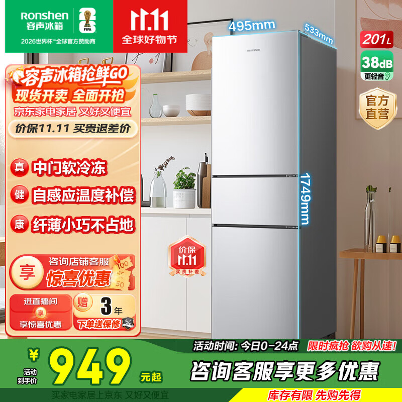 容声201升家用小户型租房用节能低噪中门软冷冻三门三温小冰箱 BCD-201E10RNLAD