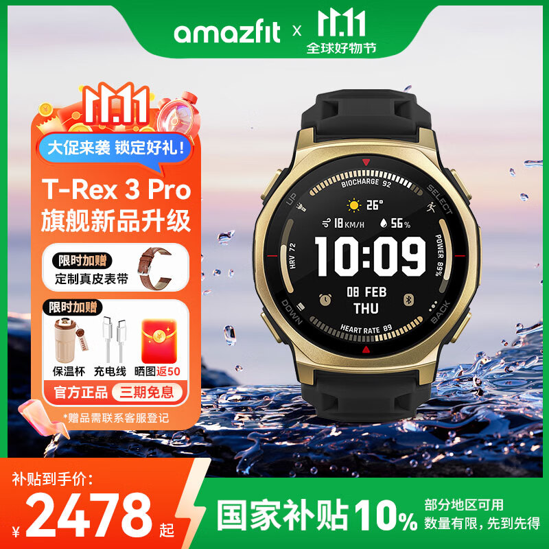 AMAZFIT华米 T-Rex3 Pro 钛合金智能手表水肺潜水游泳跑步户外运动专业双频GPS六星定位轨迹导航44mm 鎏金黑