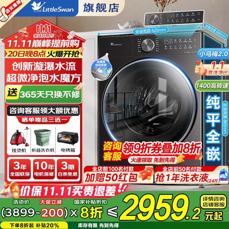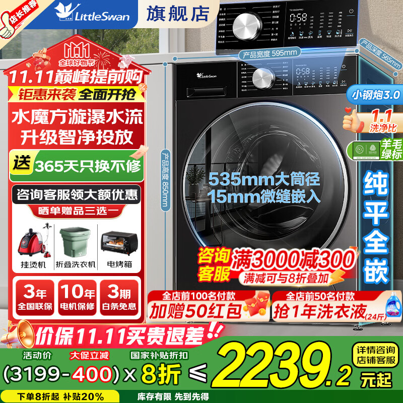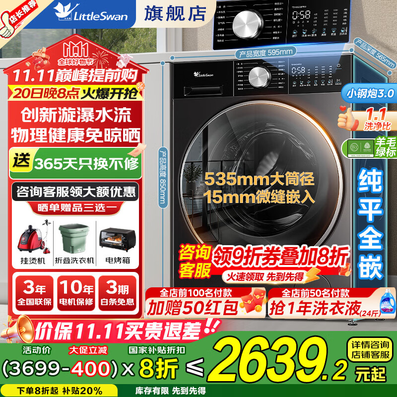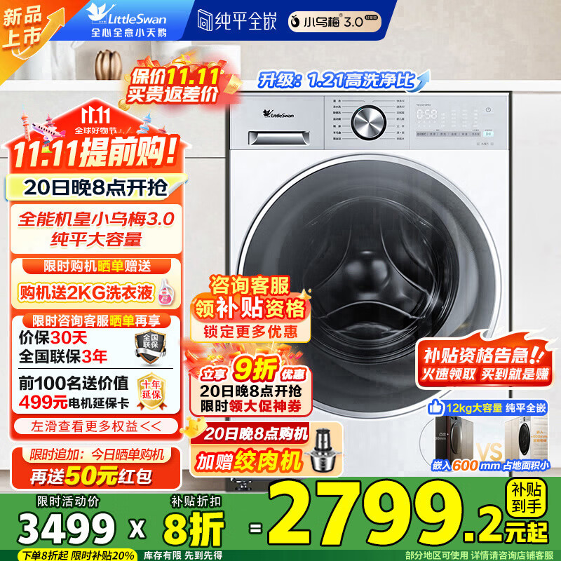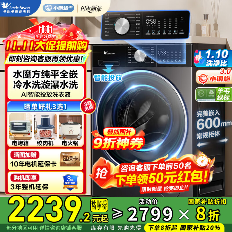 小天鹅(LittleSwan)滚筒洗衣机全自动国家补贴 小乌梅3.0/小钢炮 单洗/洗烘一体 10/12公 斤超薄全嵌水魔方 以旧换新 【小钢炮3.0高奢-无烘干】超微净泡+羊毛绿标
