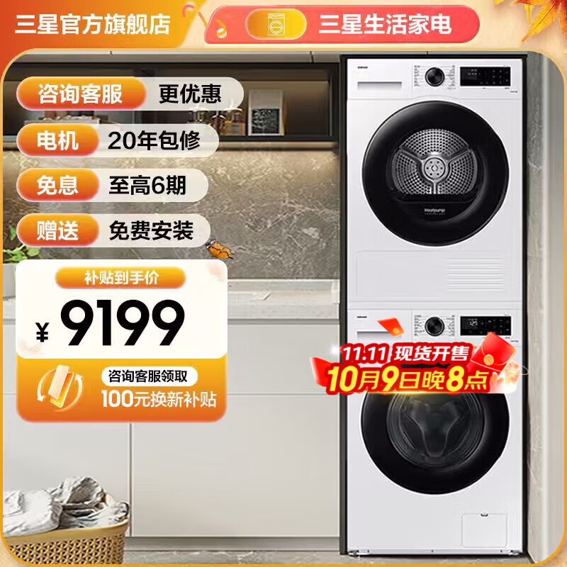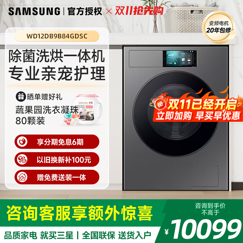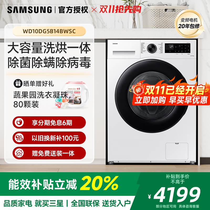 [能效补贴]三星洗衣机10公斤变频滚筒洗烘一体家用全自动AI神5系