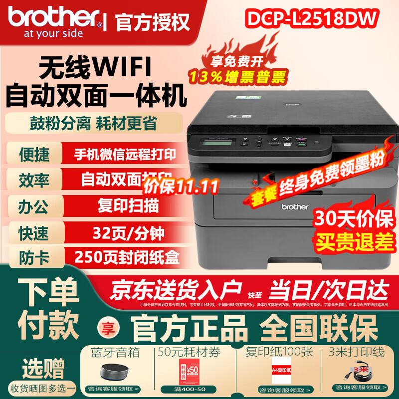 兄弟(brother)DCP-L2518DW/L2628DW/L2648DW黑白激光打印机一体机自动双面打印/复印扫描多功能无线远程家用办公 兄弟DCP-L2518DW 官方标配