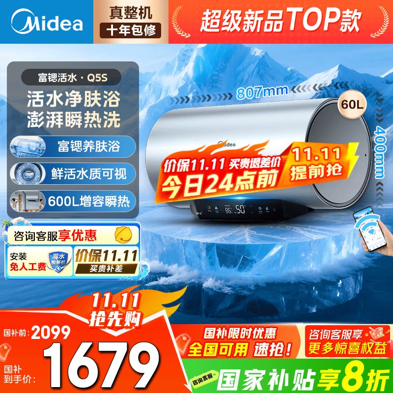 美的(Midea)电热水器60升3200W速热家用储水式免换镁棒节能省电水电分离亲肤活水净水洗Q5Spro/Q5/Q5Sultra 60L 3200W 富锶活水洗【澎湃瞬热Q5S】