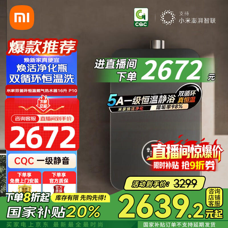 米家小米双循环恒温燃气热水器16升P10 一级零冷水双驱水伺服增压净垢护肤洗