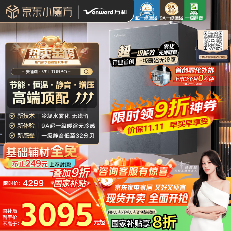 万和(Vanward)【安睡洗V9L TURBO·无冷凝管】16升燃气热水器天然气一级能效恒温一级暖浴增压静音 国家补贴20%