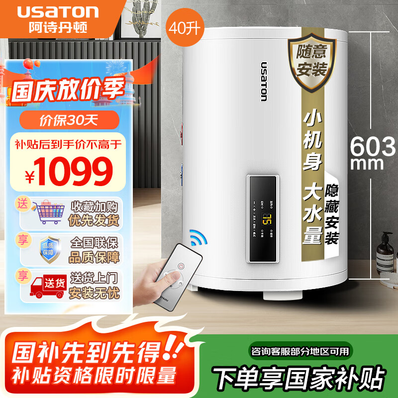 阿诗丹顿(USATON)40升立式电热水器落地式竖挂式2000W小尺寸热水器短款隐藏式储水式家用洗澡国家补贴 KC51-W40D20