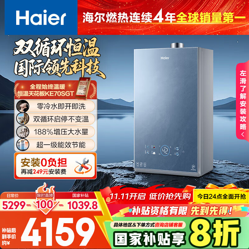 [政府换新补贴]海尔燃气热水器双循环天然气家用静音增压KL7S恒温