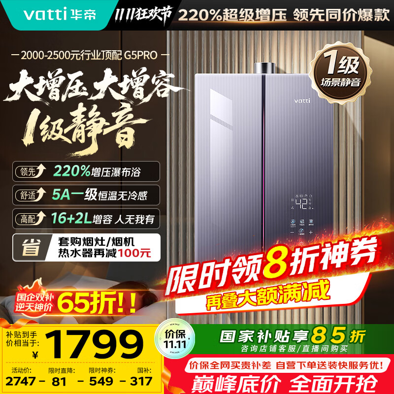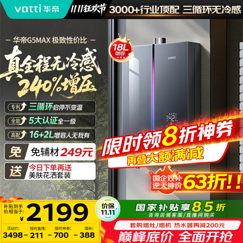 华帝(VATTI)【升级240%增压+三循环恒温+一级静音】国家补贴15% 无冷感G5max 18升燃气热水器天然气i12581E-16