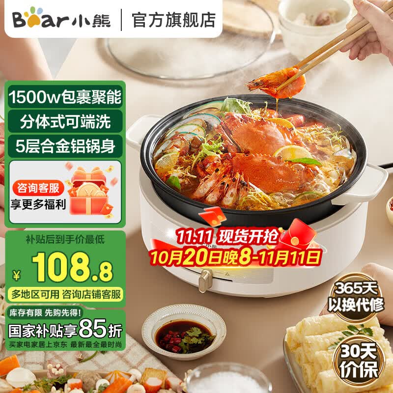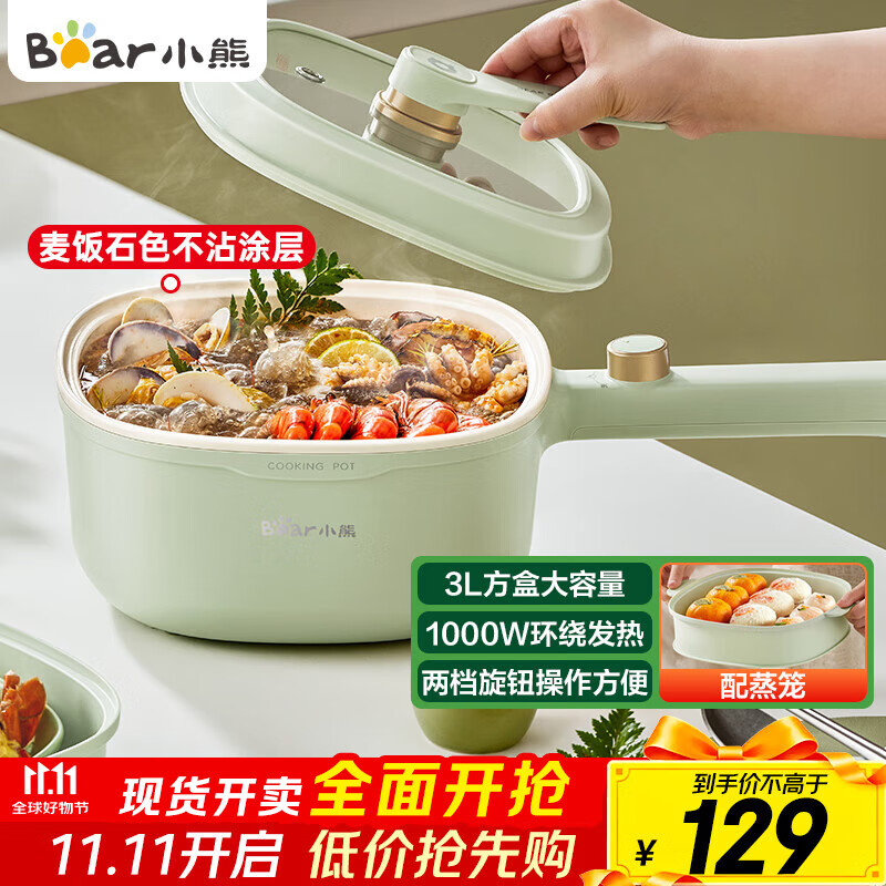 小熊(Bear)双灶电煮锅分体式电炒锅1-2人用煎炒蒸煮一体多功能锅宿舍小电锅电热锅家用电火锅料理锅多用途锅 1.4L +1.2L分体独立【煮锅+炒锅+蒸笼】