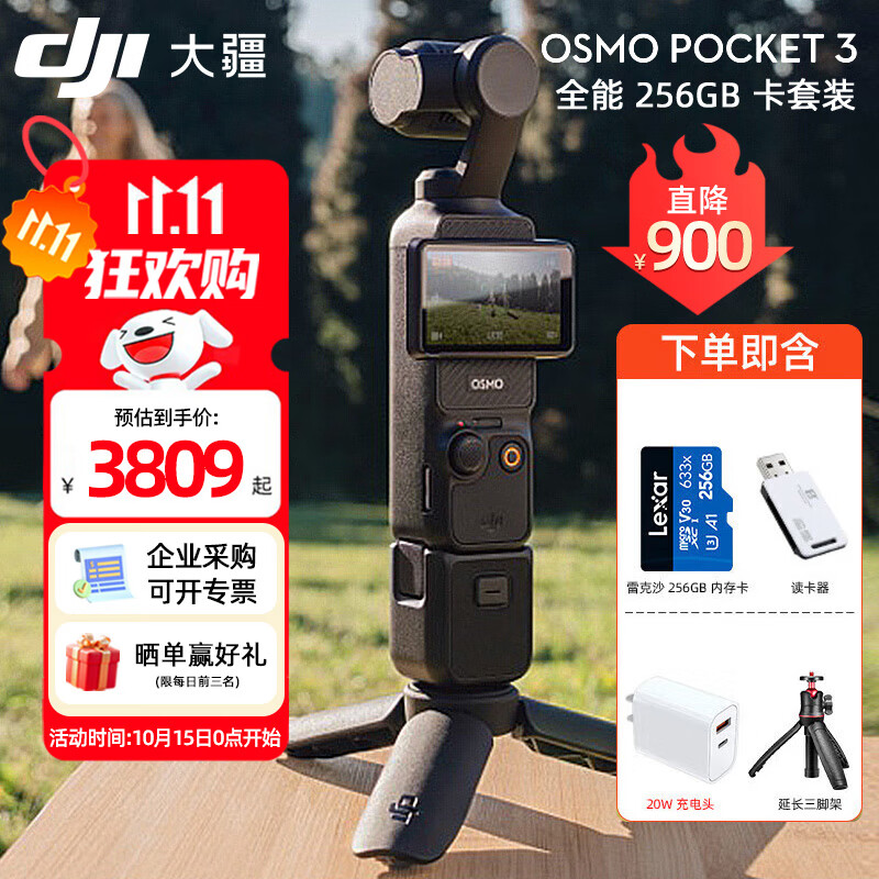 大疆(DJI)Osmo Pocket 3 一英寸口袋云台相机官方 OP 灵眸手持数码相机高清防抖 旅游vlog 便携美颜摄像机 全能套装【256G 卡礼包】 官方标配