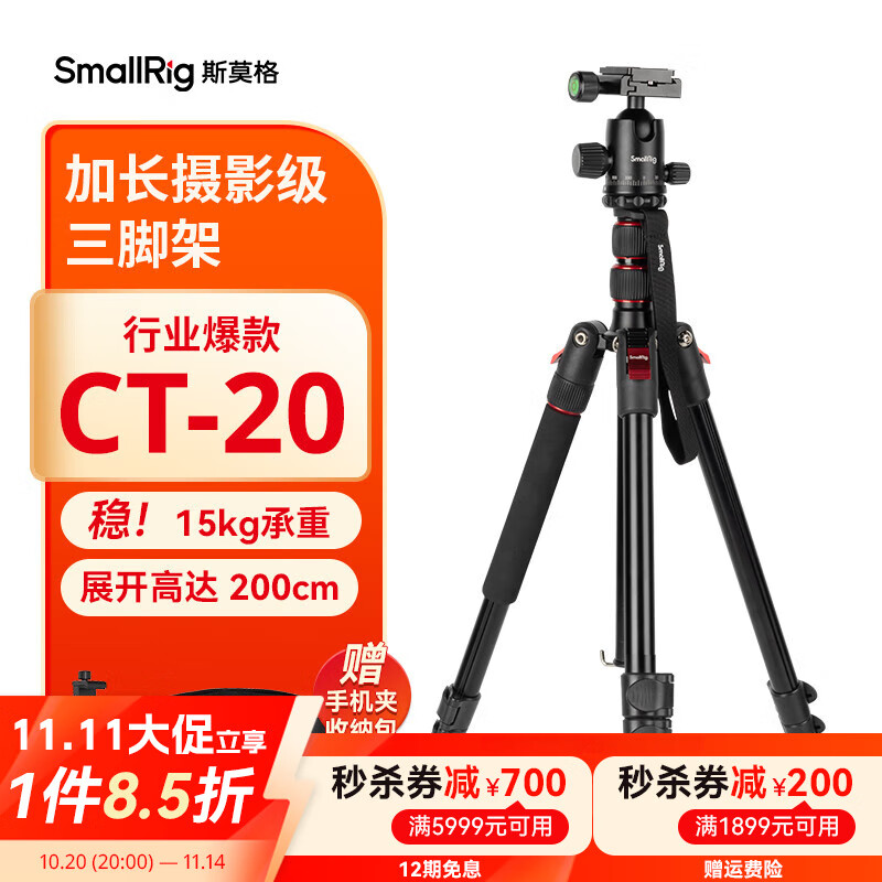 斯莫格(SmallRig)相机三脚架专业单反摄影便携摄像机手机稳定相机支架自拍直播拍照微单录像户外独脚液压云台三角架 【升级加长款】CT-20球头云台三脚架