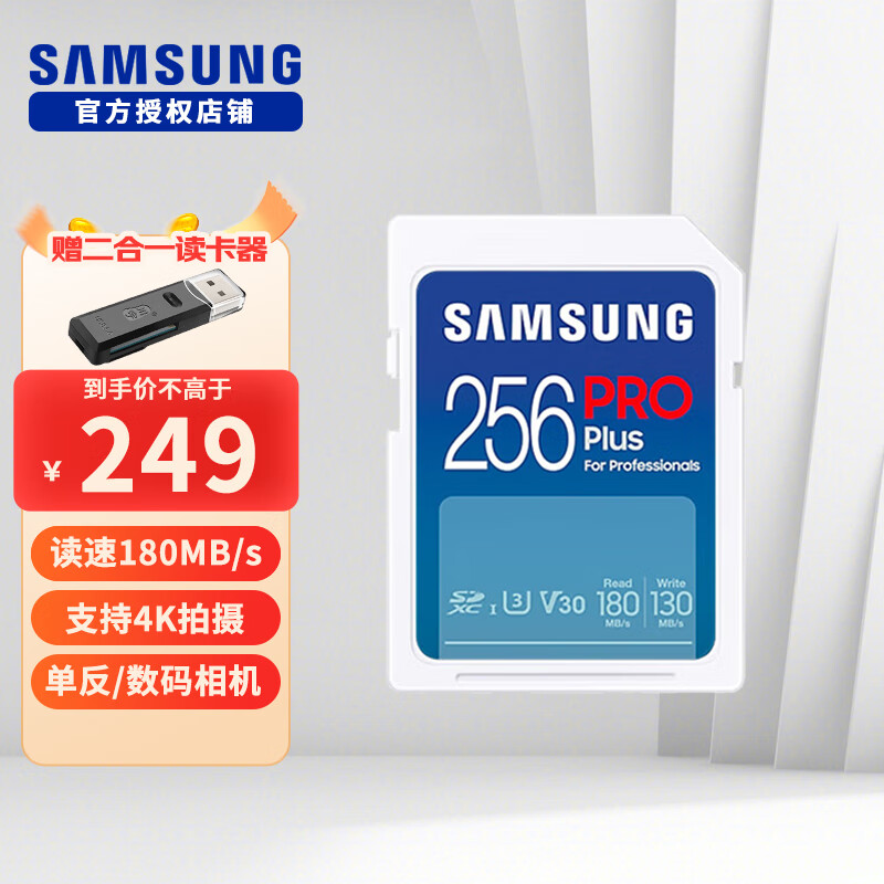 三星(SAMSUNG)内存卡 数码相机单反微单摄像机用UHS-I高速存储卡SD大卡 RPO PLUS 256GB 4K拍摄 官方标配+二合一读卡器