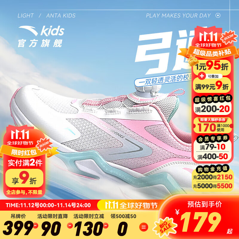 安踏女鞋儿童跑步鞋运动鞋女童鞋大童鞋2025年秋冬新款旋钮科技休闲鞋 【女弓速】安踏白/萌粉-1 36 码