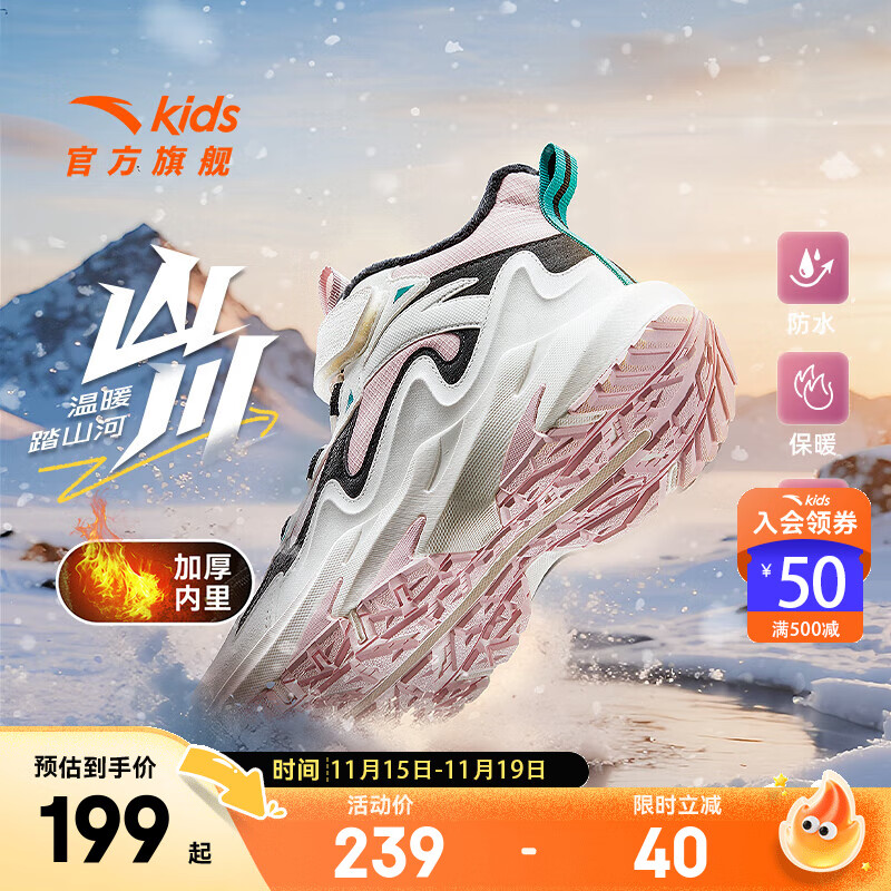 百亿补贴:安踏儿童男童皮面加绒保暖运动二棉鞋童鞋冬季雪地靴小童跑步鞋子