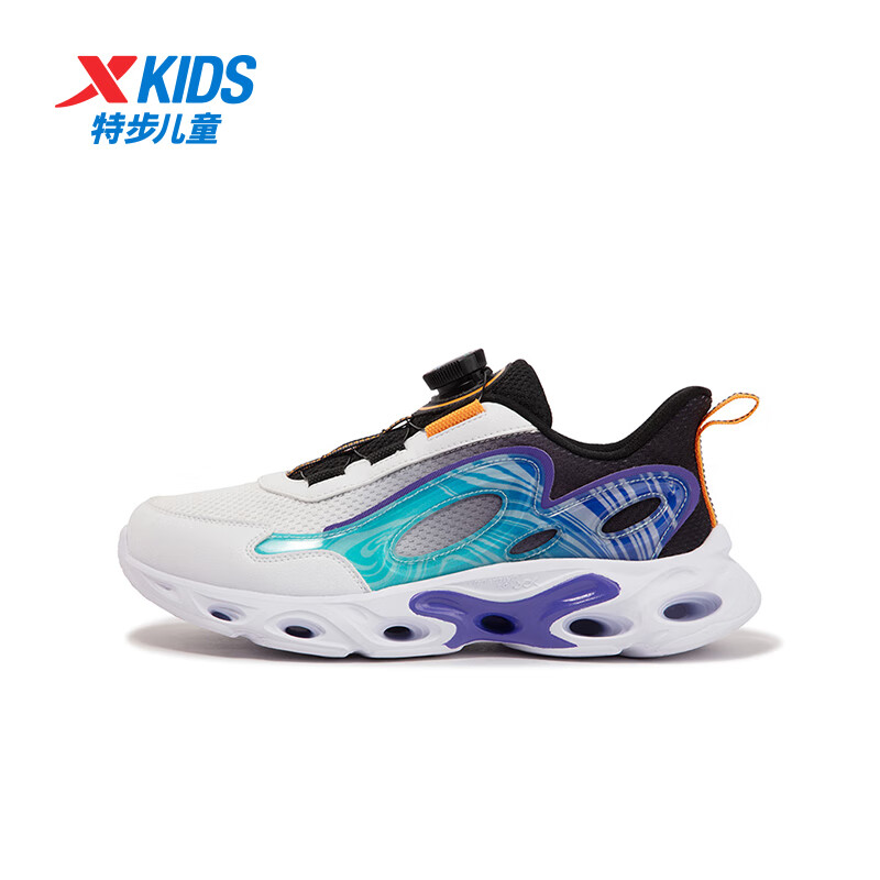 特步童鞋儿童跑步鞋男童中大童透气休闲旋钮扣运动鞋耐磨防滑跑步鞋 新白色/黑/紫外光 38