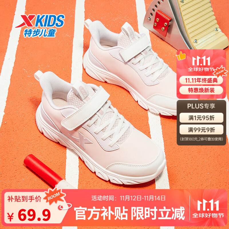 特步童鞋儿童跑鞋男童中大童四季网革防滑缓震跑鞋魔术贴搭扣运动跑鞋 水粉色/帆白 【9556革面款】 40 码