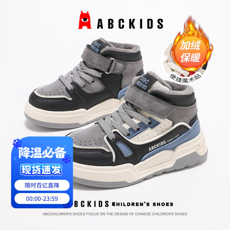 ABC KIDS童鞋儿童加绒二棉鞋2025冬季新款男女童加厚运动鞋学生保暖鞋 灰黑蓝 27 内长约17.1cm