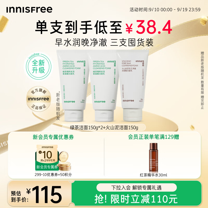 悦诗风吟绿茶洗面奶150g*2+火山洁面150g氨基酸男士女士控油保湿