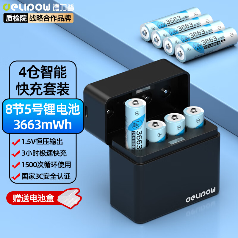 德力普(Delipow)5号充电锂电池8粒3663mWh充电仓套装AA五号1.5V快充适用话筒麦克风/智能门锁/游戏手柄/相机闪光灯