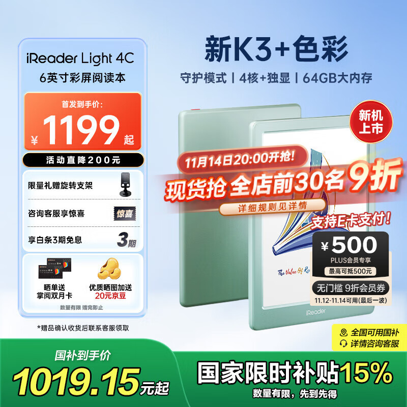 掌阅(iReader)【咨询领福利】Light4C 6英寸彩屏电纸书电子书阅读器 彩色墨水屏智能学习便携阅读本 Light 4C 语绿色单机