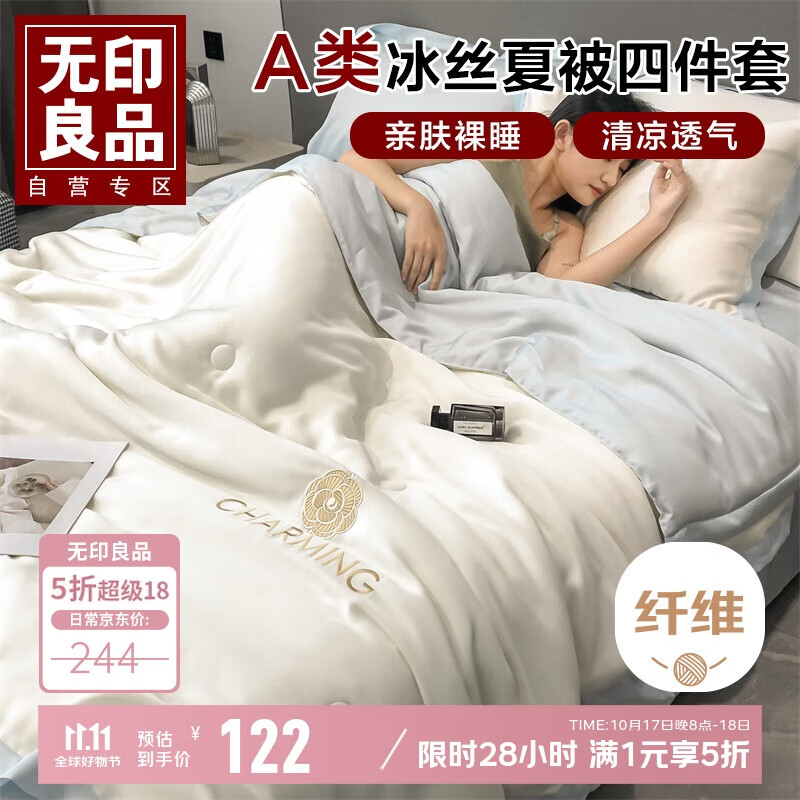 无印良品A类冰丝夏被四件套 夏凉薄被子空调被芯凉感床单枕套 200*230cm