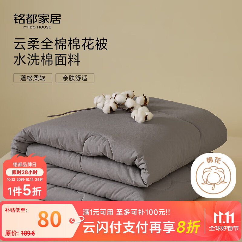 MIDO HOUSE铭都春秋纯棉被子被芯棉被新疆棉100%棉花被单人被初暖灰150X200