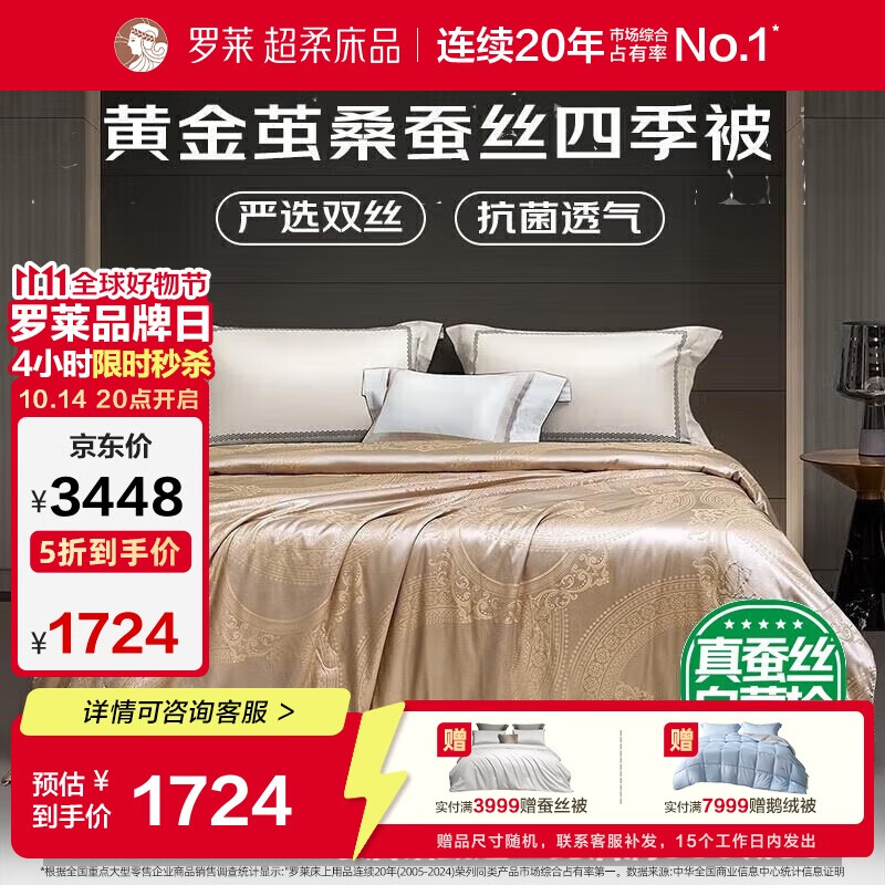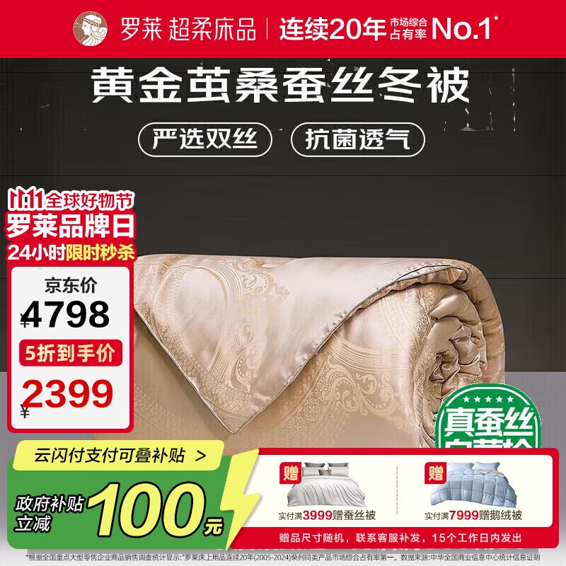 罗莱家纺 蚕丝被子 100%黄金桑蚕丝抗菌防螨大提花四季被芯 净重8.3斤
