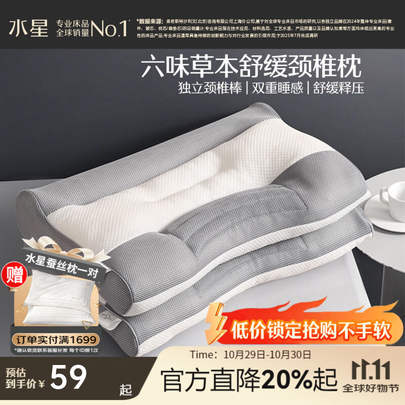水星家纺枕头颈椎枕 决明子草本枕芯 荞麦薰衣草人体工学成人枕头 舒缓颈椎-六味草本枕 单只 灰 40cm*60cm