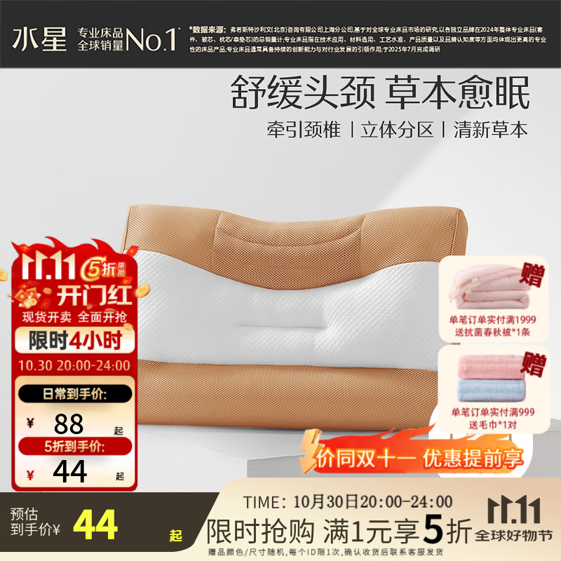 水星家纺枕头颈椎枕护颈枕 决明子薰衣草枕头 成人枕芯 六味草本颈椎枕-金【单枕】