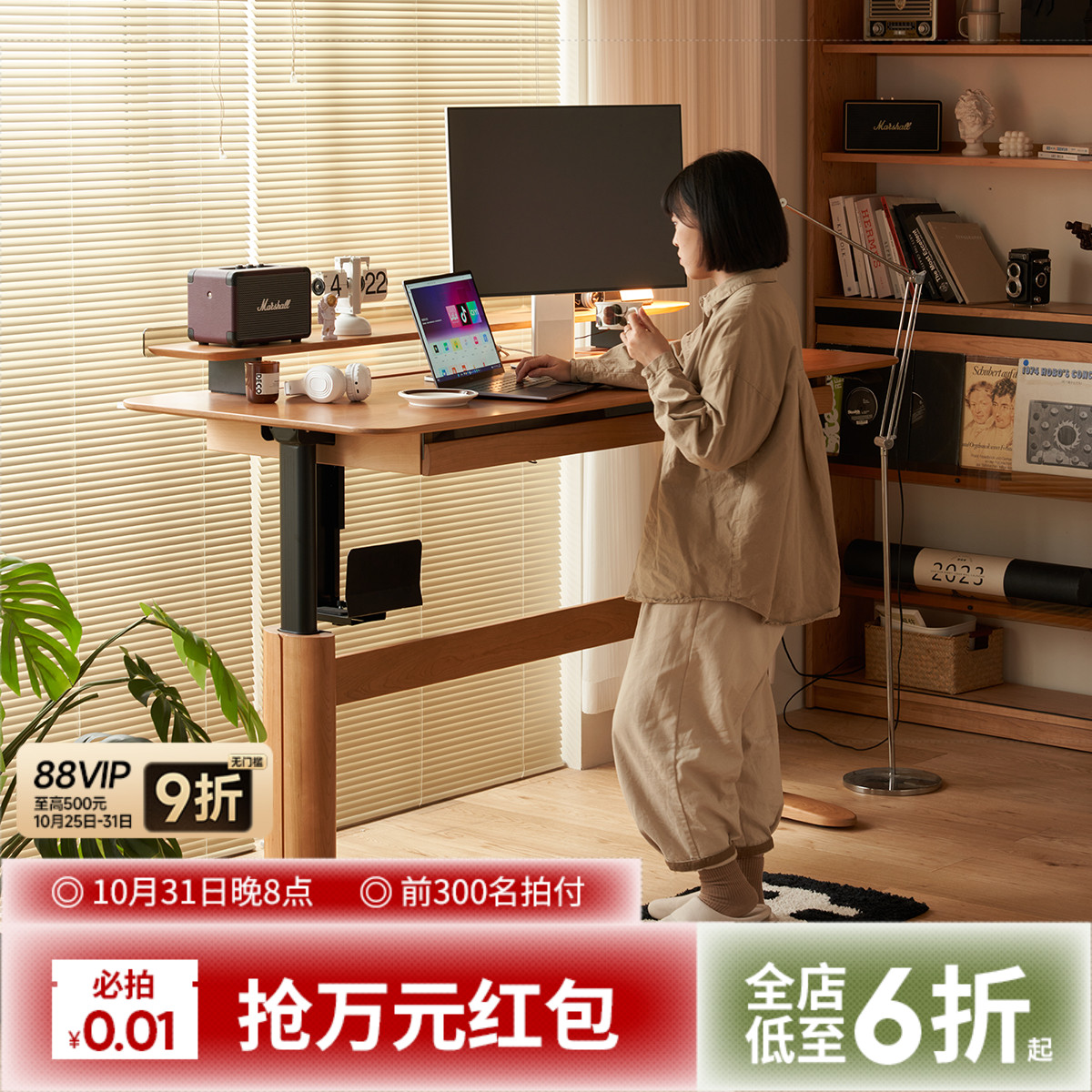 出乎生活UP电动升降桌实木日式家用书桌樱桃木电脑学习桌工作台