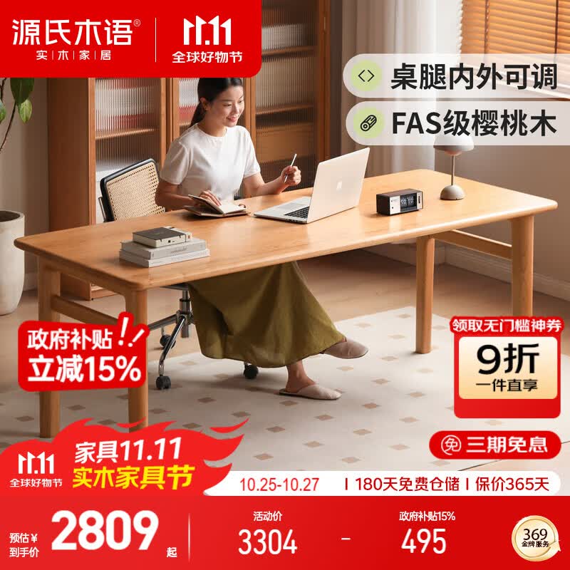 源氏木语实木书桌办公桌大工作台靠墙电脑桌家用餐桌樱桃木写字桌2.0m