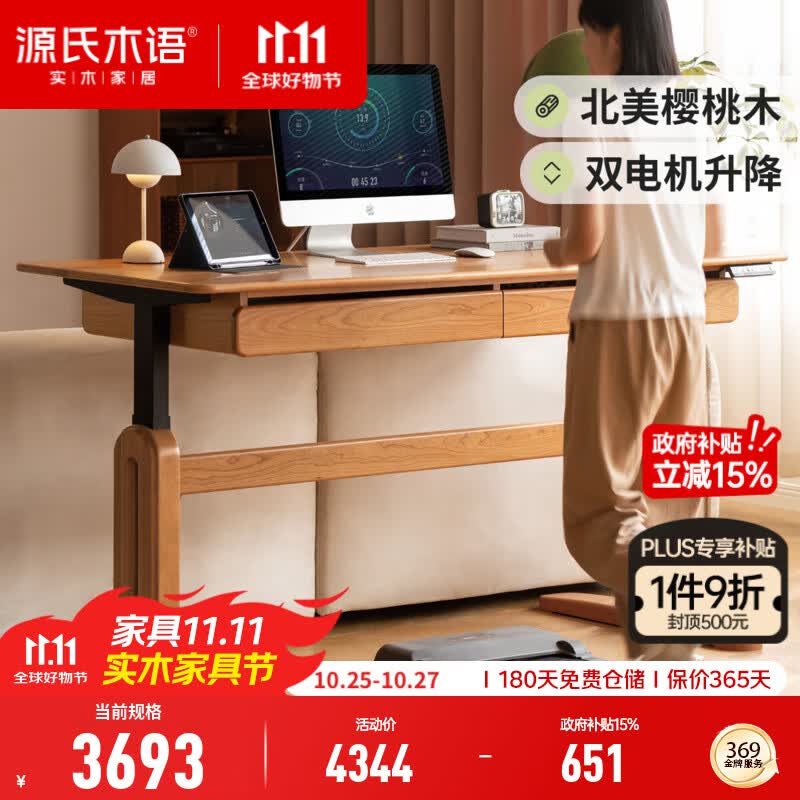 源氏木语实木书桌书房樱桃木电动升降桌现代简约双电机办公电脑桌 1.8米双电机升降桌