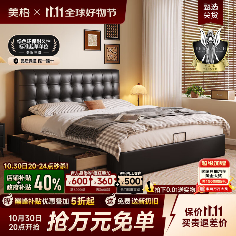 美柏意式极简真皮床三抽储物床中古风简约现代卧室小户型软包双人床 头层牛皮【豪华版】床+椰棕床垫+单柜 【气压结构】1.8*2.0M