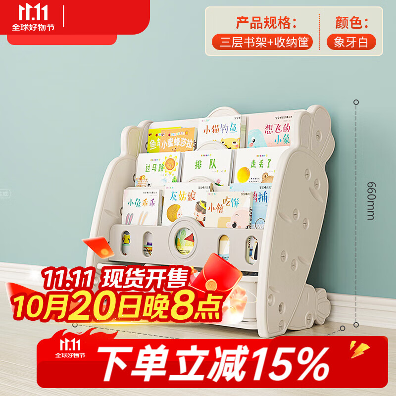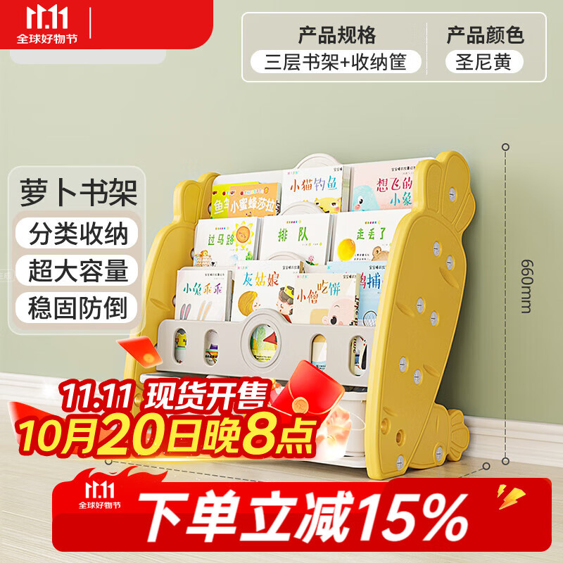哈比树儿童书架家用收纳架书本宝宝玩具绘本架落地多层小型收纳柜置物架 【圣尼黄】三层书架+收纳筐 【造型可爱 分类收纳 稳固防倒】