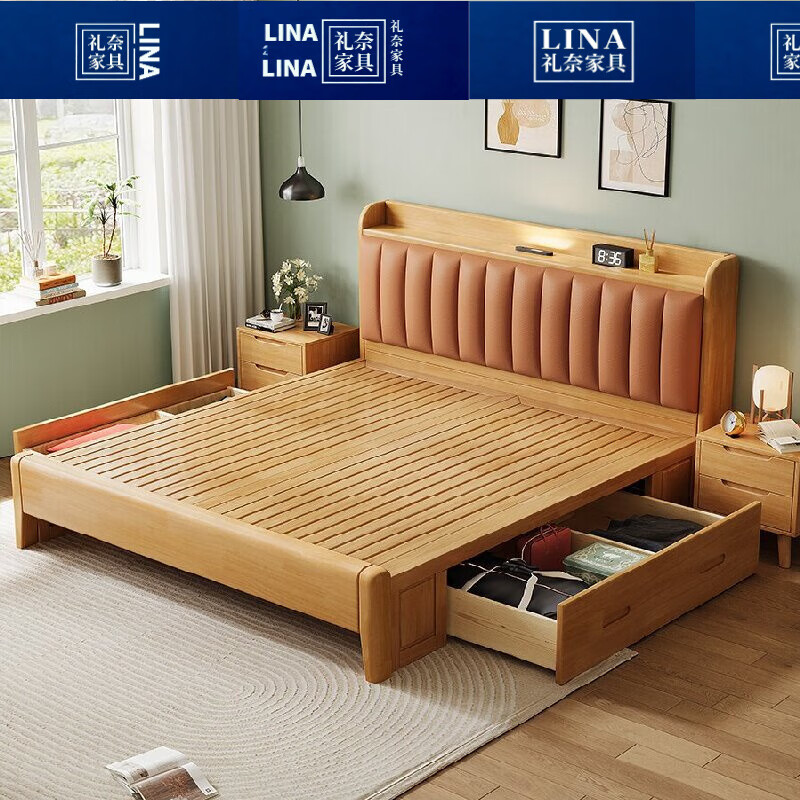 礼奈现代简约主卧橡胶木实木大床主卧软靠1.8米双人床北欧原木风家具 1.8m箱框结构(颜色备注) 20cm弹簧床垫