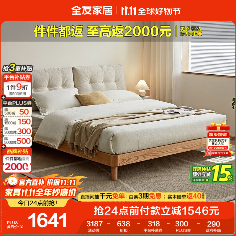 全友家居 原木风全实木橡木床主卧室大床1.8米x2米布艺软包双人床家具