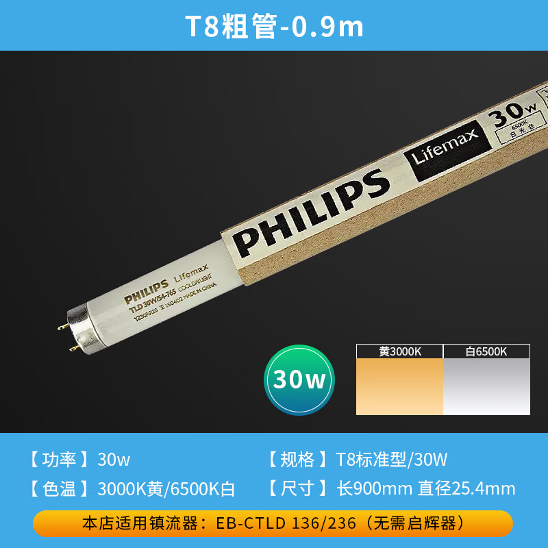 飞利浦(PHILIPS)灯管 日光灯管标准型节能灯T5 T8荧光灯管细管家用长条 TL8 30W 长度90cm-单支 白光6500K