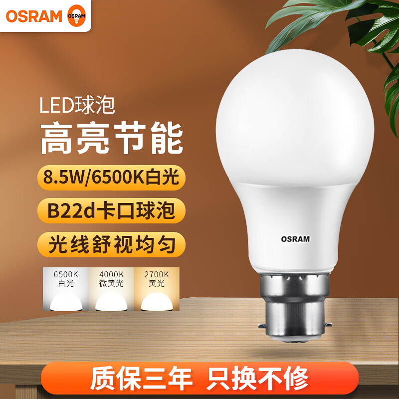 欧司朗(OSRAM)LED灯泡B22卡口节能高亮球泡家用照明光源老式挂口卡口灯泡球泡灯 8.5W-6500K白光-B22d卡口