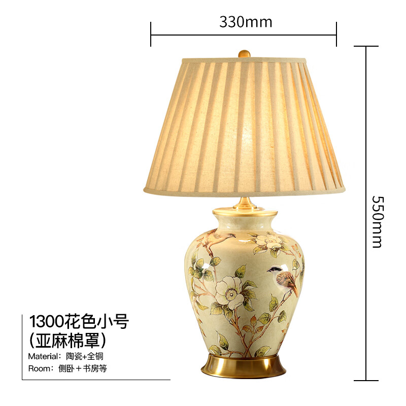 欧普照明(OPPLE)美式陶瓷台灯卧室床头灯家用温馨全铜客厅欧式床头柜婚房房间装饰 花色小号亚麻折罩 按钮开关