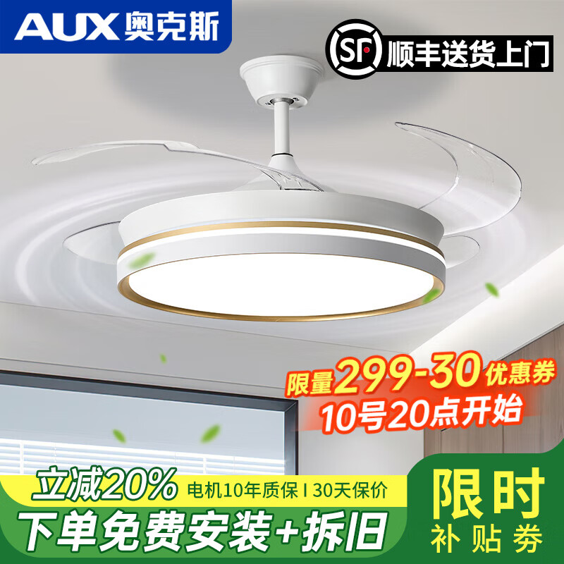 奥克斯隐形风扇灯客厅装饰电扇灯智能全光谱变光餐厅吊扇灯具卧室灯 36寸变频-(遥控)48W