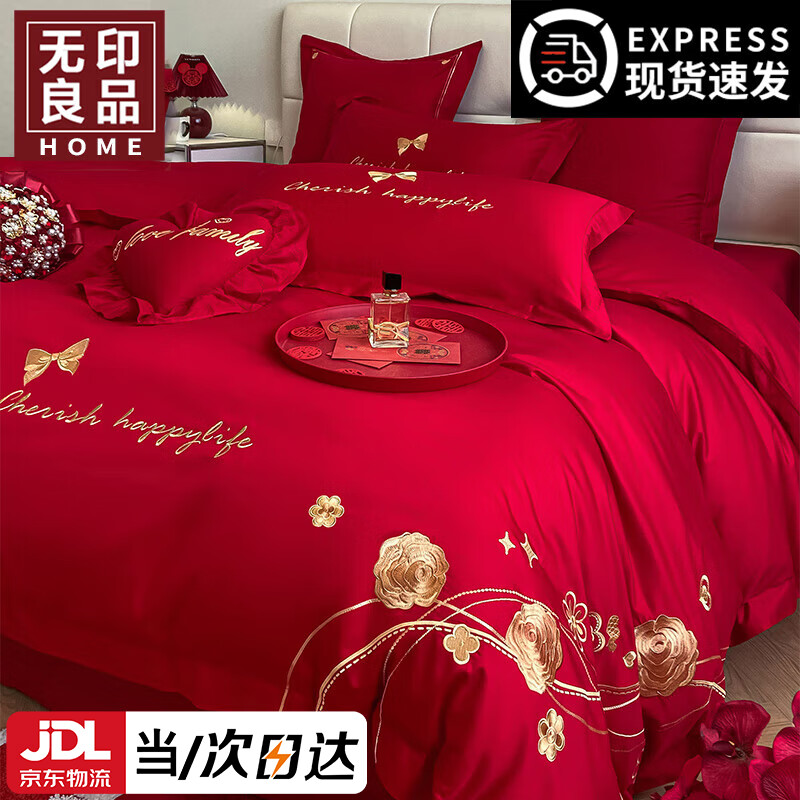 百亿补贴:无印良品 HOME高端刺绣新婚庆四件套红色床单结婚四件套纯棉100%床上用品 玫瑰 【贡缎织造工艺】 1.8m 床单款 四件套-被套200*230cm